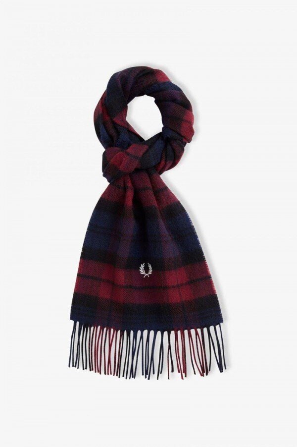 Saf kuzu yününden İskoçya’da üretilmiş ve geleneksel tartan deseniyle örülmüştür. Atkımız püsküllü kenarlar ve Defne Çelengi işlemeleriyle süslenmiştir.