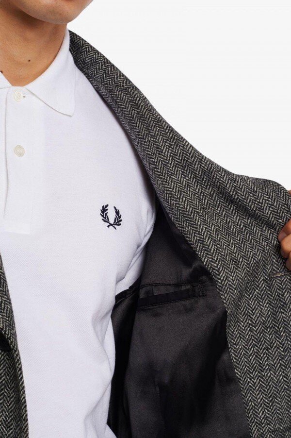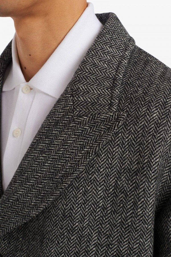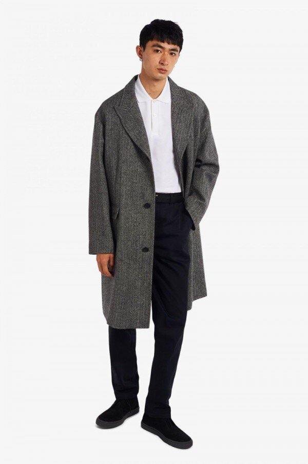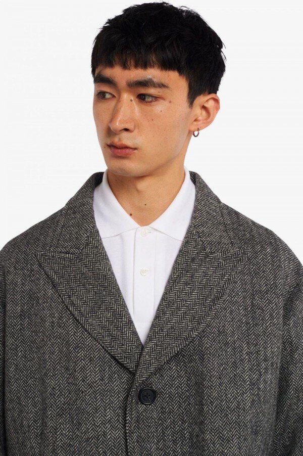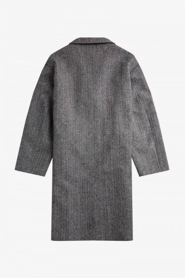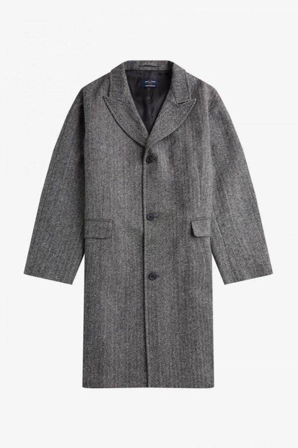 İngiltere’de üretilen klasik paltomuz, Balıksırtı dokuma, bol kesim ve ikonik Fred Perry detaylarıyla.