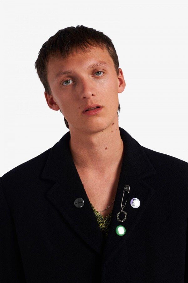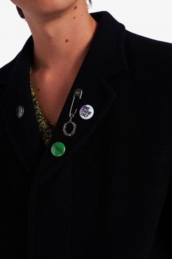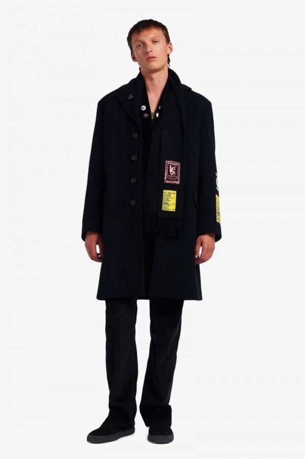 Simons, tanıdık Fred Perry silüetlerini kendi adını taşıyan serisinin duyarlılığıyla yeniden yorumluyor ve grafik sanatçısı Tom Tosseyn tarafından yaratılan benzersiz sanat eserleriyle süslüyor. Punk’tan new wave’e kadar müzik sahnelerinin DIY ruhunu yansıtan ve kurgusal canlı müzik mekanlarının geçiciliğini kutlayan Simons’ın özel dikim palto yorumu, vintage bir modele dayanıyor ve İngiltere’de %100 yün balıksırtı dokumadan üretiliyor. Yakalarda dekoratif metal rozetler, kollarda iki baskılı yama ve bir Defne Çelengi tılsımı gibi kişiselleştirilmiş detaylara sahip olan Simons, geleneksel stili asi bir ruhla birleştirerek klasiği yeniden yorumluyor. Fred Perry x Raf Simons koleksiyonunu giymek, bir şeyin parçası olmak demektir; gençliğin ve aidiyetin gücü.