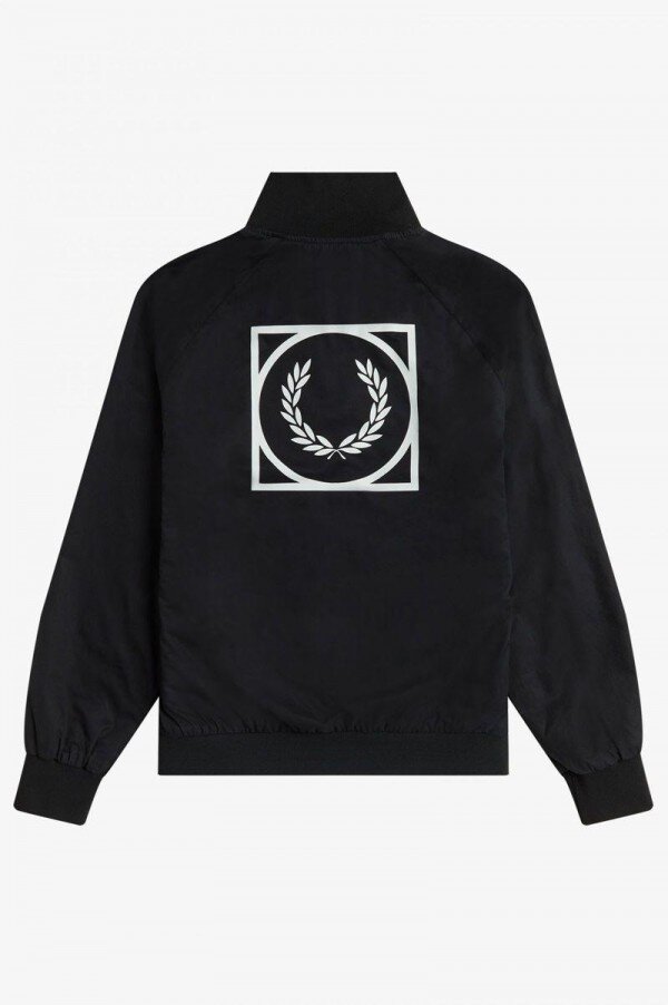 Cesur bir Defne Çelengi sırt grafiğine sahip, çarpıcı, minimalist fermuarlı ceket.
