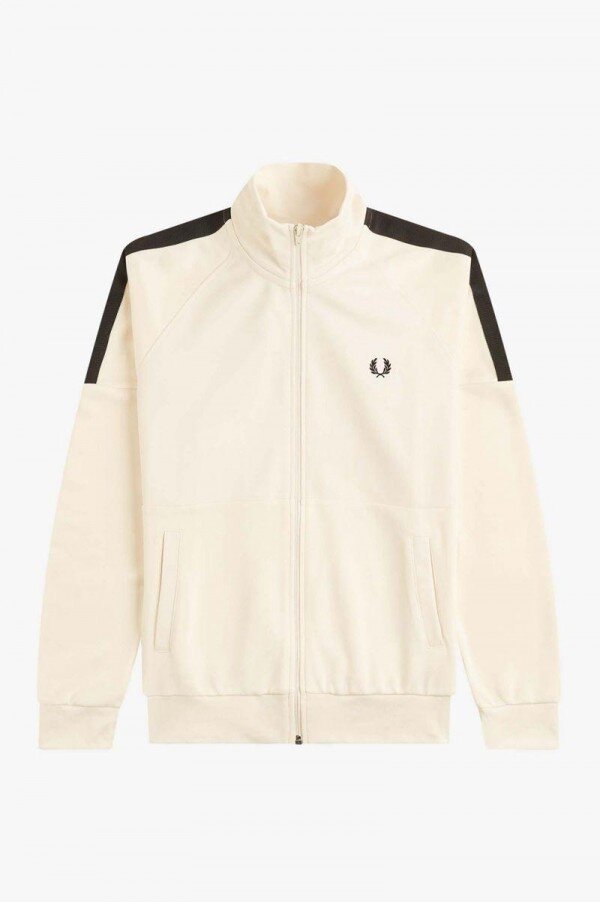 Huntu yaka, kontrast paneller ve Fred Perry’nin imzası olan mat triko kumaştan yapılmış bir eşofman altı.