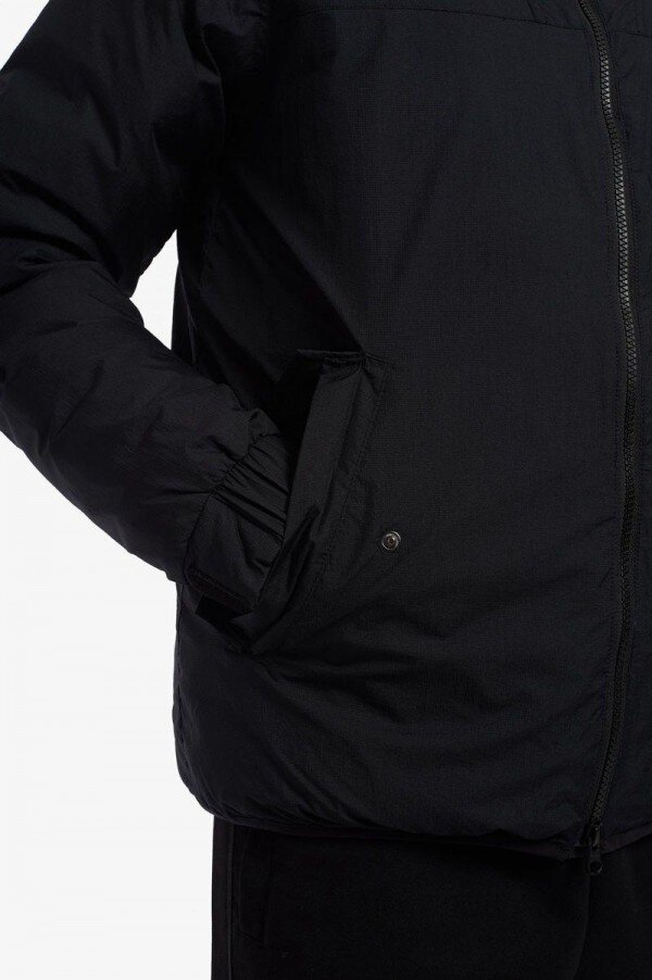Dayanıklı naylon Ripstop / Büyük kapüşonlu normal kesim / Yerel kaynaklı polyester elyaf dolgu / Pamuklu çekmeli çift yönlü fermuar / Kapaklı cepler ve ayarlı elastik manşetler