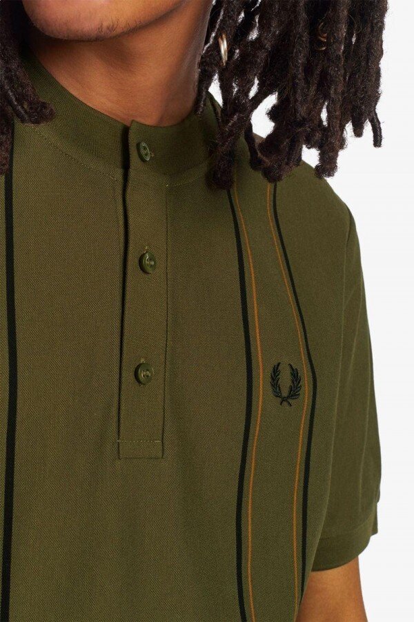 Kökleri İngiliz spor giyimine dayanan bir tasarım olan Henley tişörtümüz, imza niteliğindeki düğme çıtası ve yüksek yuvarlak yakasıyla öne çıkıyor. Ayırt edici şerit tasarımı ve Fred Perry’nin imzalı detaylarıyla bu tişört, modernist üniformalara olmazsa olmaz bir katkı.