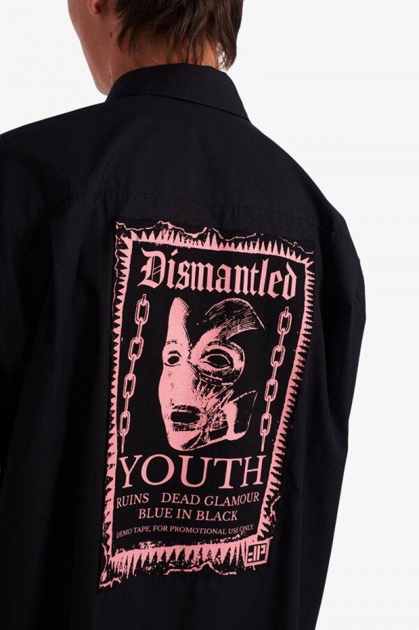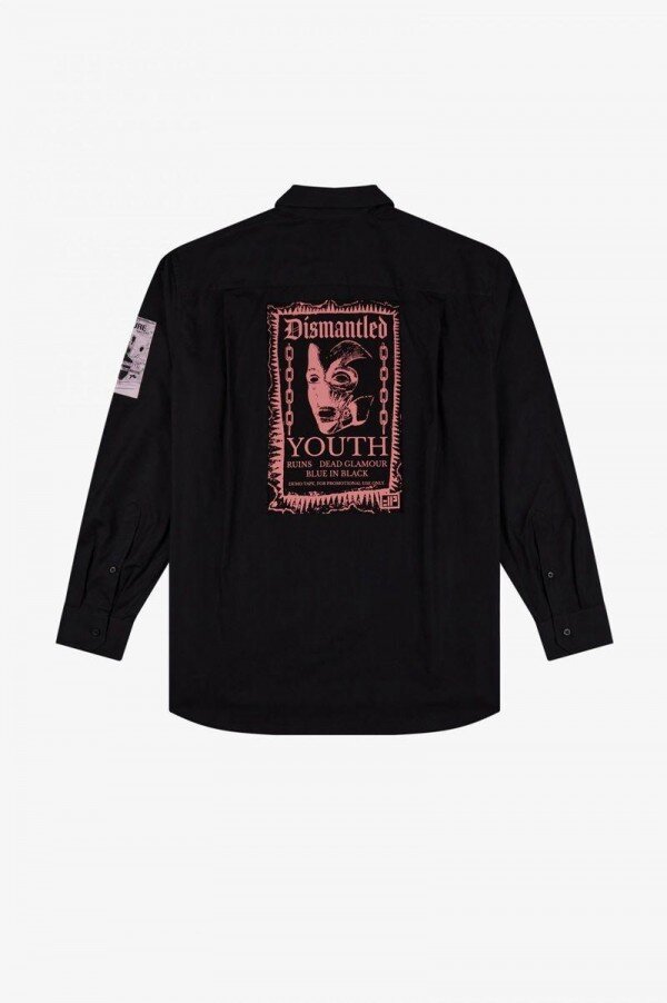 Raf Simons, siyah gömleği hayal gücünün bir tuvali olarak kullanarak, gece hayatının DIY ruhunu temsil eden ikonografi ekliyor.