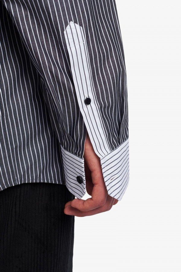 Raf Simons’ın imzası olan bol kesim tasarımla, canlı pamuklu poplin kumaştan çizgili bir gömlek tasarladık. Gece hayatının ikonografisini yansıtan rozet ve dikişli yamalar içeriyor.