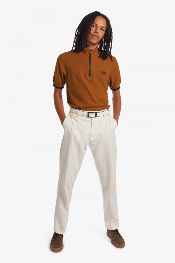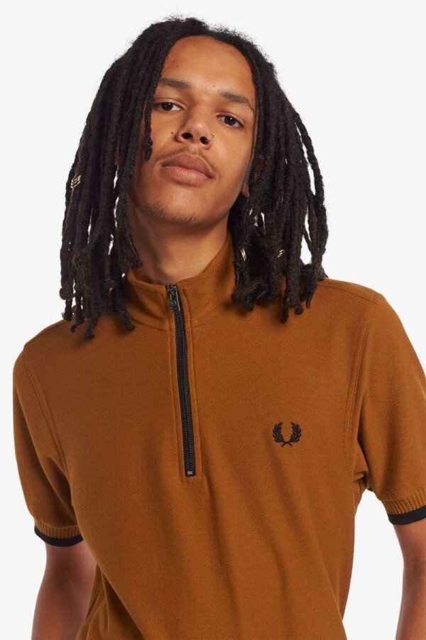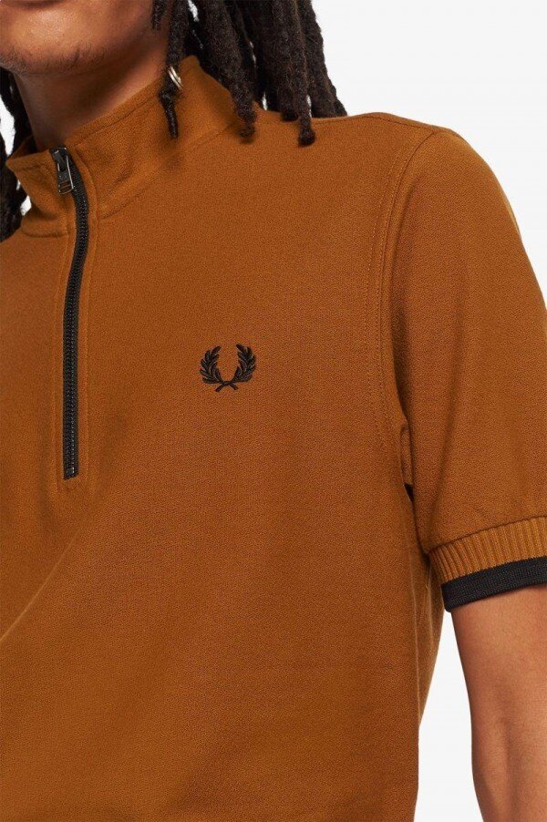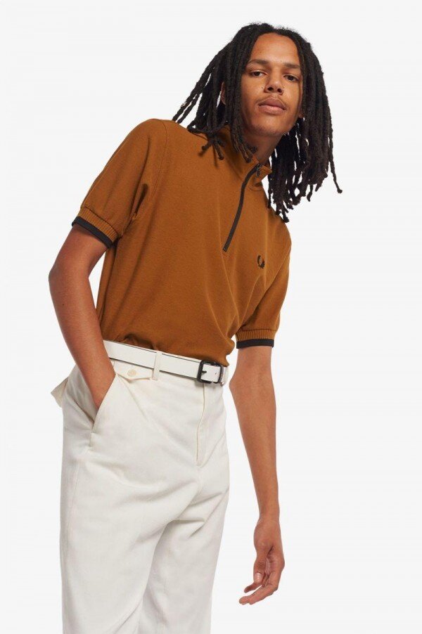 Bisiklet sporu, 60’lar ve 70’lerin modern stillerinin o dönemin kıtasal örme bisiklet formalarından ilham almasıyla uzun zamandır modernist üniformaları etkilemiştir. Huni Yaka Polo tişörtümüz, bisiklet formasının klasik fermuarlı açılışını alıp pamuklu bir polo tişörte ekler. Baştan sona Fred Perry.