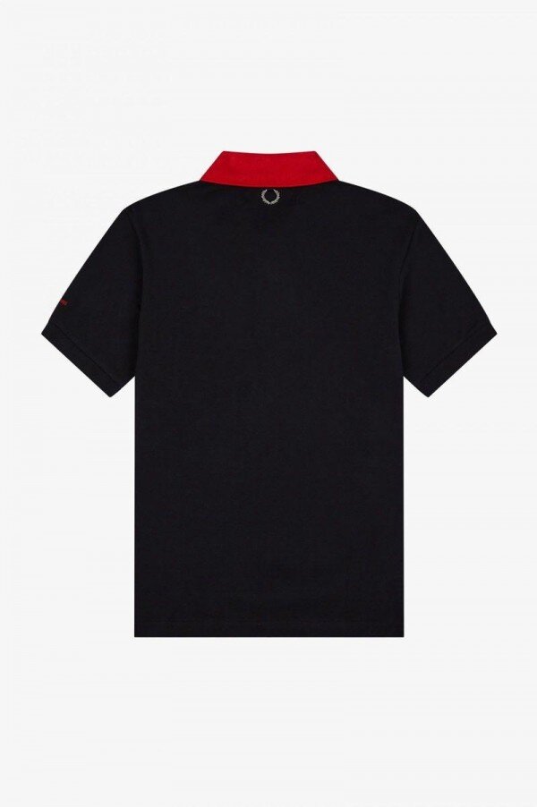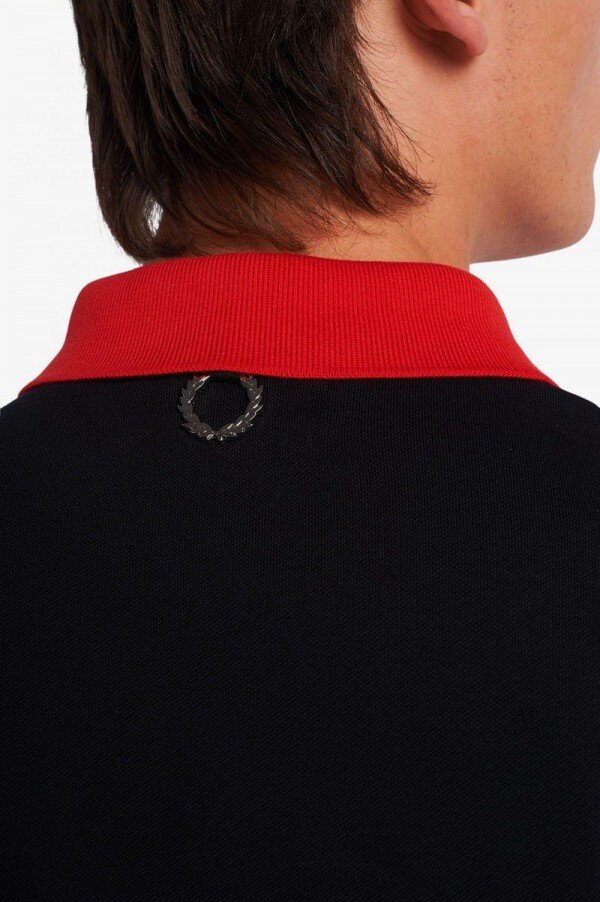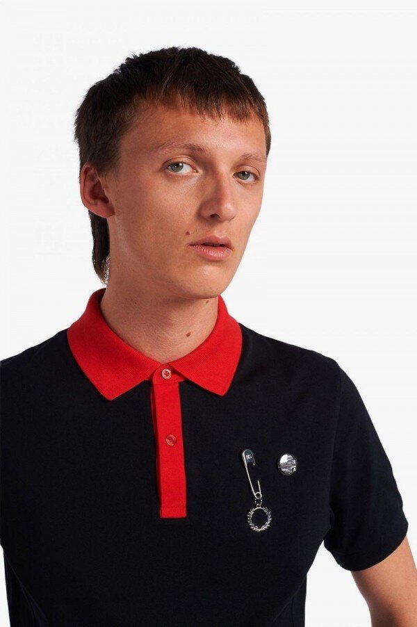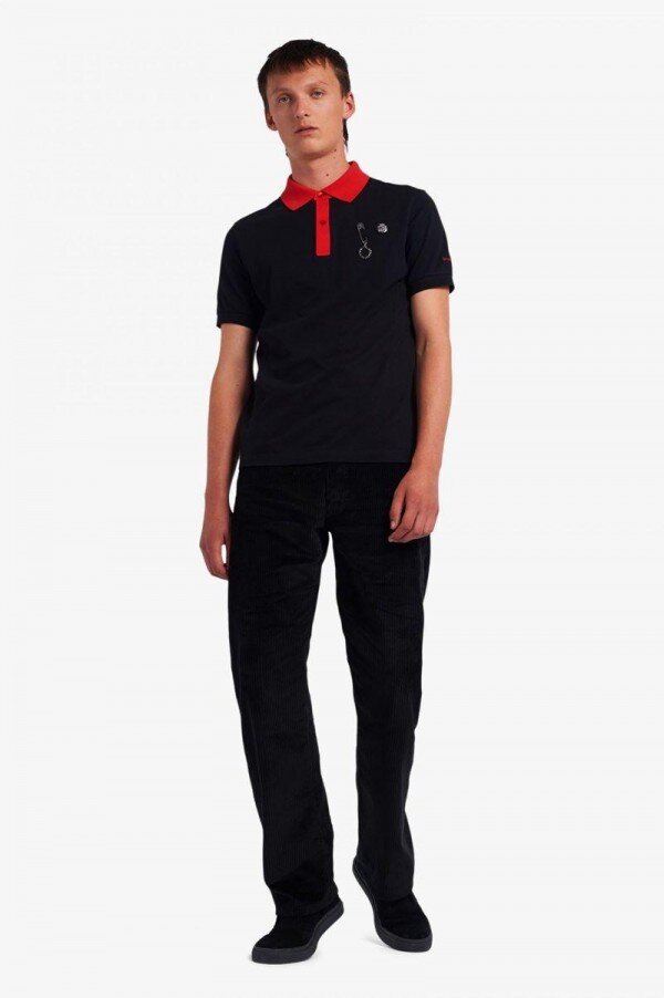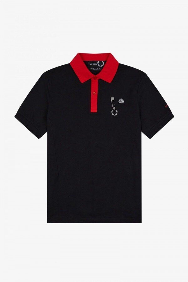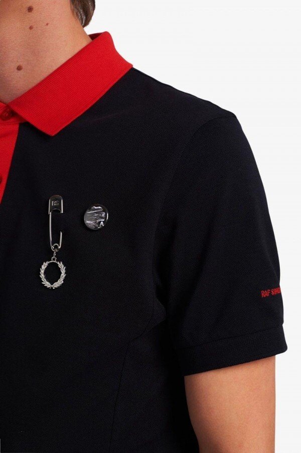 Siyah pamuklu pike Fred Perry gömleği için Raf Simons ile iş birliği yaptık. Bu gömleğin kontrast kırmızı yakası ve süsleri, ayrıca kişiye özel metal rozetleri var.