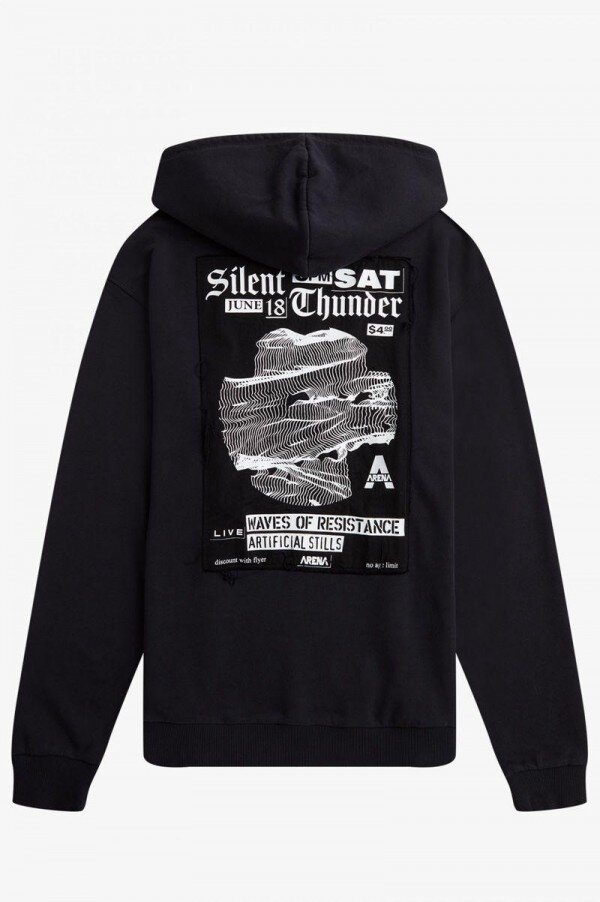 Simons, tanıdık Fred Perry silüetlerini kendi adını taşıyan serisinin duyarlılığıyla yeniden yorumluyor ve grafik sanatçısı Tom Tosseyn tarafından yaratılan benzersiz sanat eserleriyle süslüyor. Punk’tan new wave’e kadar müzik sahnelerinin DIY ruhunu yansıtan Simons’ın siyah kapüşonlu sweatshirt’ü, “eskitme” yıkama efekti, ön gövdede bir kanguru cebi, parlak gümüş bir Defne Çelengi iğnesi süsü, arka gövdede büyük bir poster yaması ve imzalı Raf Simons işlemeleriyle öne çıkıyor. Geleneksel stili asi bir ruhla birleştiren, yeniden tasarlanmış bir klasik. Fred Perry x Raf Simons koleksiyonunu giymek, bir şeyin parçası olmak demektir; gençliğin ve aidiyetin gücü.