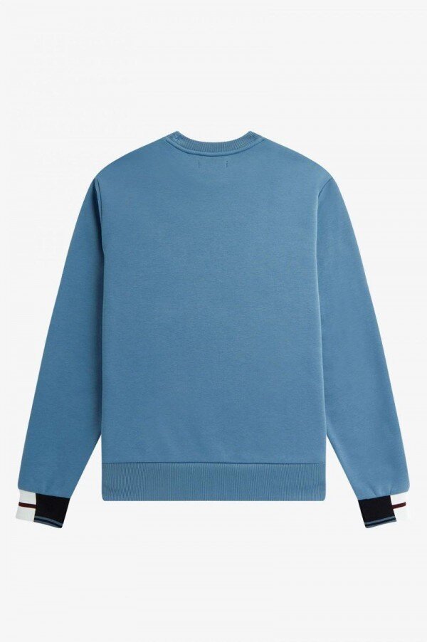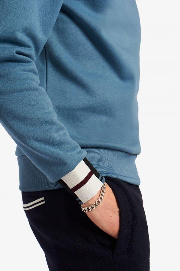 Efsaneye göre, ikili uçlama yöntemimiz, Lillywhites’tan bir alıcının Fred’in düz renk tenis tişörtüne futbol takımı renklerinin eklenmesini istemesiyle ortaya çıktı. Sadece biz 5-4-4 oranında uçlama kullanıyoruz; bu bizim DNA’mızın bir parçası. İmza detayımıza cesur bir dokunuş katan bu sweatshirt’ün manşetlerinde soyut bir tasarım var.