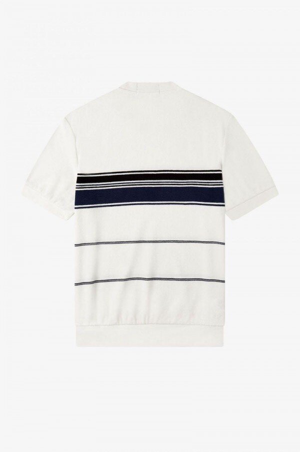 Arşivimizde bulunan tasarımlardan ilham alan Yeniden Üretim koleksiyonumuz, orijinal parçaları yönlendirici bir stille yeniden yorumluyor. En yeni koleksiyonumuz, 1970’lerin lüks Fred Perry kıyafetleriyle tatilde olan genç erkek ve kadınları tasvir eden eski salınca etiketleri ve bagaj etiketlerinden ilham alıyor. Fred Perry, aralıksız ve cesur bir gezgindi ve tasarımlarımız ticari hava yolculuğunun altın çağına ve Fred’in maceracı ruhuna bir saygı duruşu niteliğinde. Pamuklu havlu kumaştan Portekiz’de üretilen bu parçanın ön gövdesinde belirgin bir şerit tasarımı bulunuyor. Kort dışında şık bir şekilde seyahat edin.