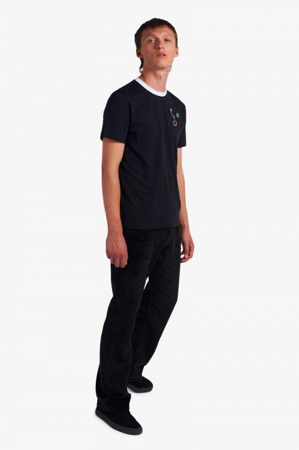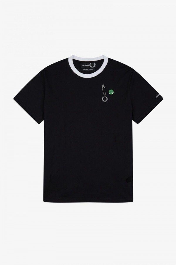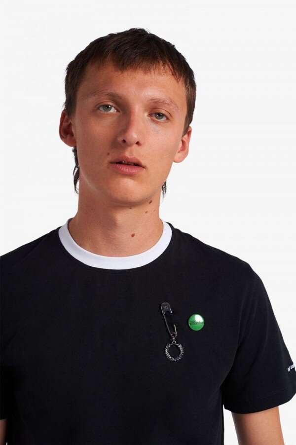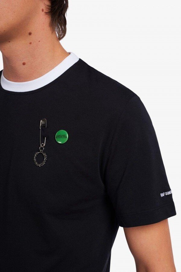 Simons, tanıdık Fred Perry silüetlerini kendi adını taşıyan serisinin duyarlılığıyla yeniden yorumluyor ve grafik sanatçısı Tom Tosseyn tarafından yaratılan benzersiz sanat eserleriyle süsleyerek kurgusal canlı müzik mekanlarının geçiciliğini kutluyor. Simons bize %100 pamuklu tek jarse kumaştan üretilmiş klasik kesim bir tişört sunuyor. Özellikler arasında kontrast ribana yaka detayı ve boynun arkasında parlak gümüş metal bir Defne Çelengi ve sol göğüste bir Defne Çelengi tılsımı gibi Raf Simons ve Fred Perry imzalı detaylar yer alıyor. Geleneksel stili asi bir ruhla birleştiren yeniden tasarlanmış bir klasik. Fred Perry x Raf Simons koleksiyonunu giymek, bir şeyin parçası olmak demektir; gençliğin ve aidiyetin gücü.