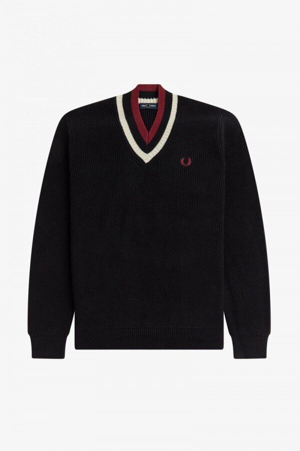 V yakalı kazak, başlangıçta 50’lerde tenis kortunda ısınmak için tasarlanmış, ardından alt kültür ikonları için şık bir temel parça haline gelmiştir. Bir gömleğin yakası ve düğme çıtası için mükemmel bir çerçeve olan V yaka, sınıf isyanının bir ifadesi olarak giyildikten sonra, sonunda 70’lerin ortalarındaki modacılar ve kabadayılar tarafından sınıf dışında da benimsenmiştir. En son versiyonumuz, kalın dokulu bir pamuk karışımından üretilmiştir ve çizgili bir V yaka ve bol kesime sahiptir.