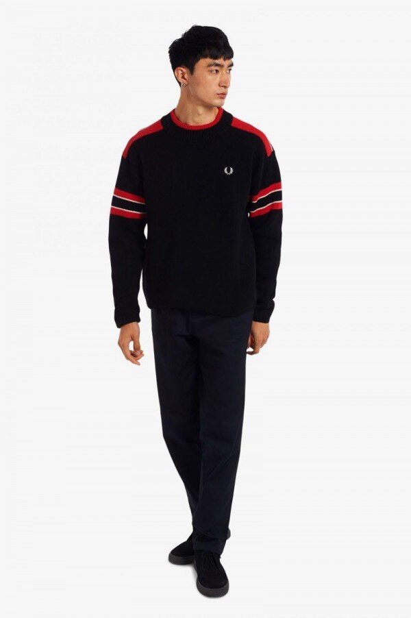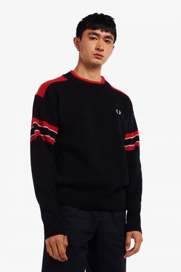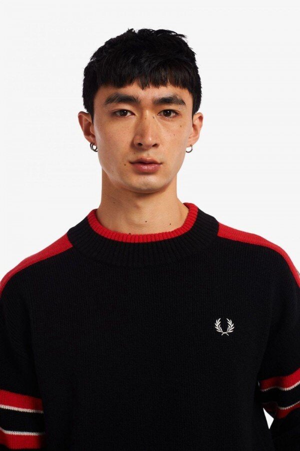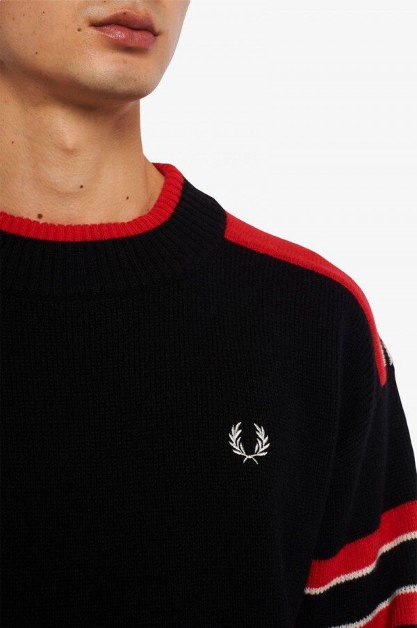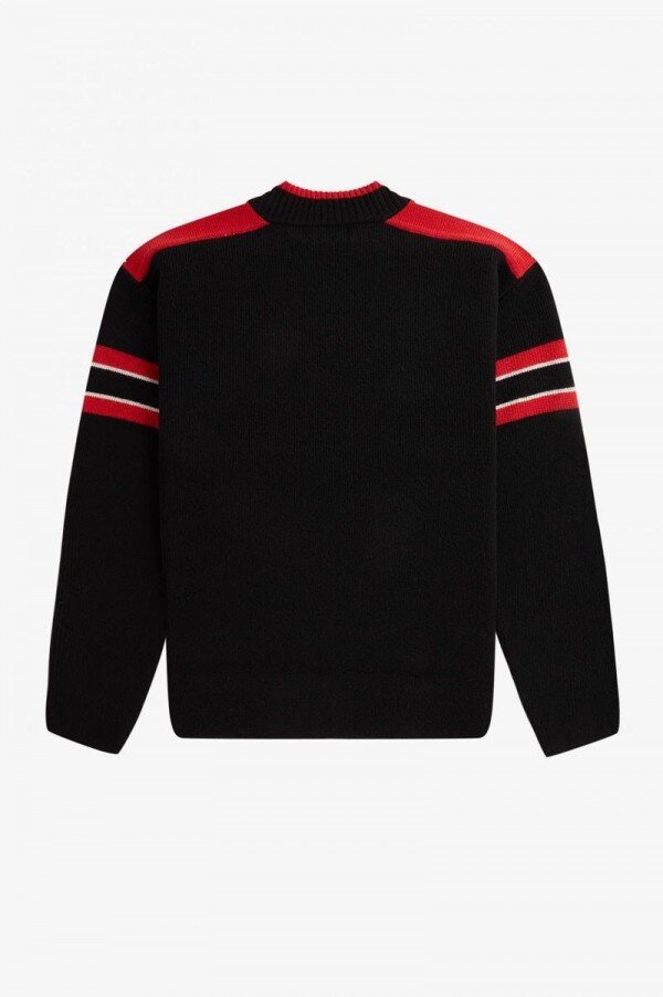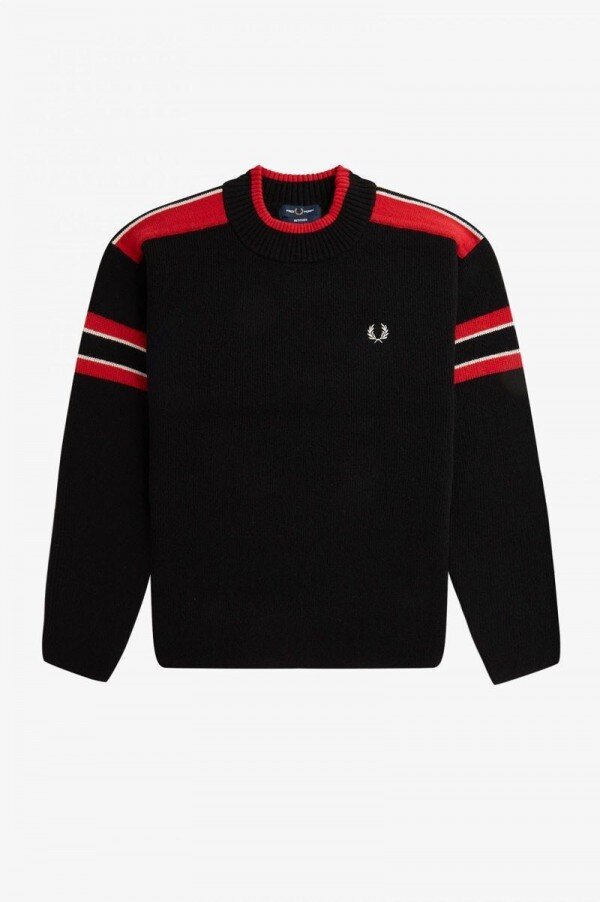 Siyah, kırmızı ve ekru renklerde kontrast çizgili omuz paneline sahip kuzu yünü karışımı yuvarlak yakalı kazak.