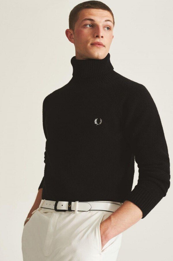 Yorkshire’da dokunmuş kalın dokulu yünden, İngiltere’de üretilmiş balıkçı yaka kazak. Fred Perry’nin imza detaylarıyla tasarlandı.