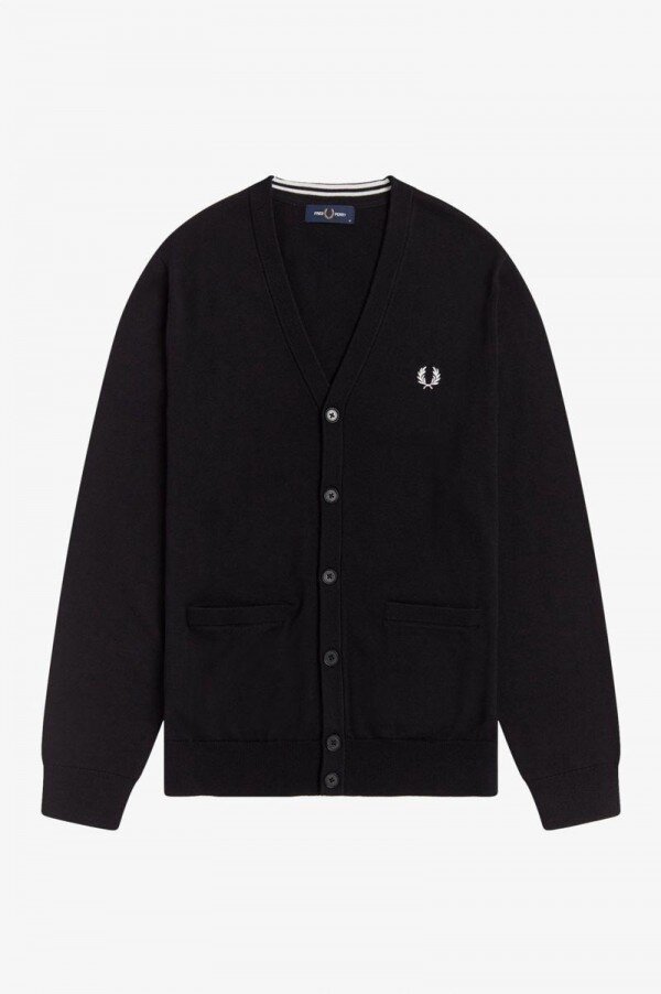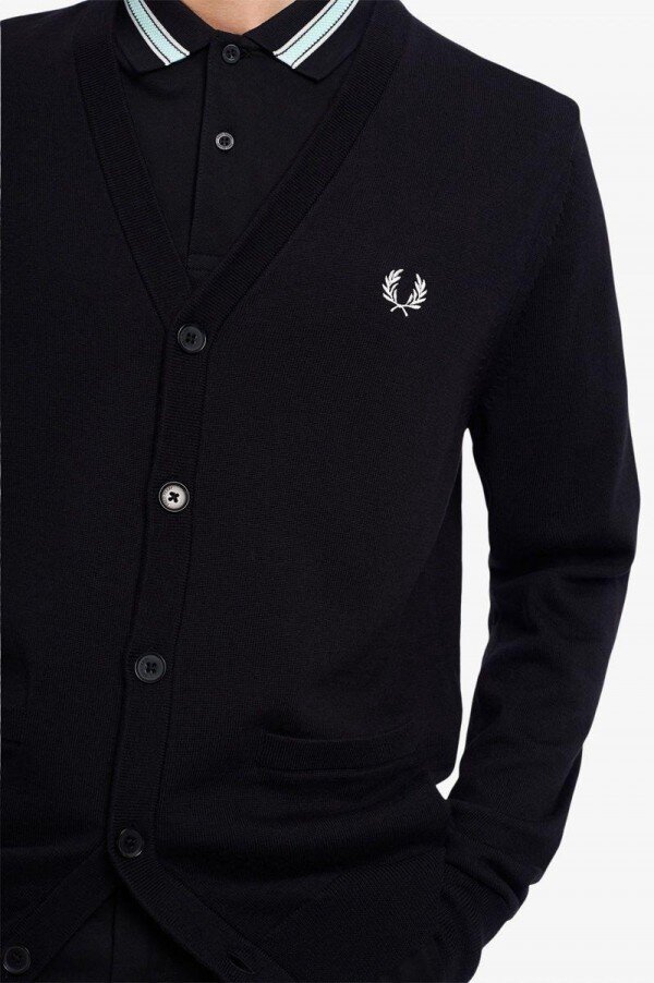 Pamuk ve etik kaynaklı merinos yünü karışımından örülmüş V yakalı hırka.