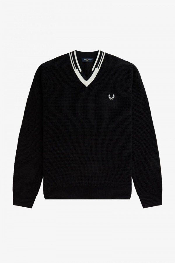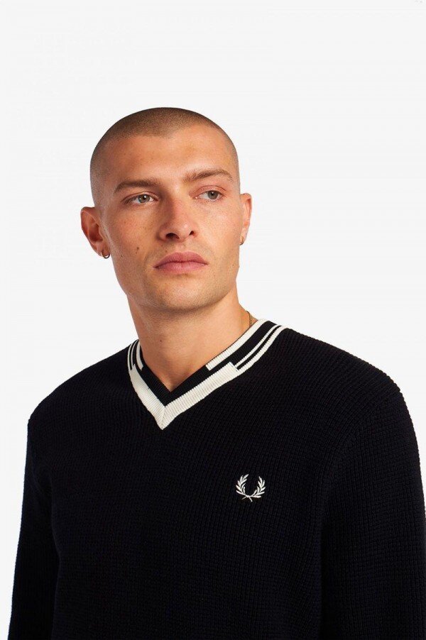 İngiliz alt kültür üniformalarının şık bir parçası haline gelmeden önce, klasik V yakalı kazağımız aslında tenis kortunda ısınmak için tasarlanmıştı. Bir gömleğin yakası ve düğme çıtası için mükemmel bir çerçeve olan V yaka, aynı zamanda sınıfta isyankarlığın bir ifadesi olarak da giyilirdi. Ablaları gibi, çocuklar da kuralları çiğnemeden esnetmek için Defne Çelengi’ni giydiler. Kalın dokulu bu versiyon, yaka kısmında cesur bir soyut tasarımla imza çift uçlamamızı benimsiyor.