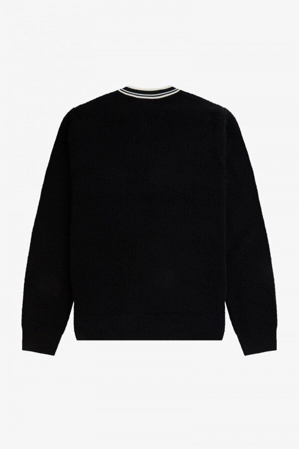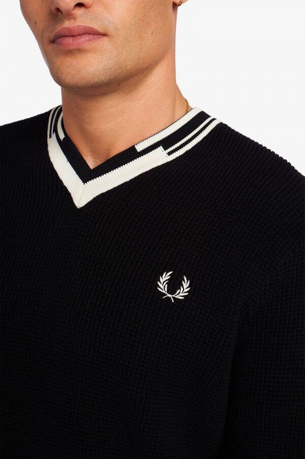 Etik kaynaklı yün ve pamuk karışımından örülmüş, kalın dokulu dikişle tasarlanmış rahat bir V yakalı kazak. Yaka kısmında soyut uçlarla süslenmiştir.