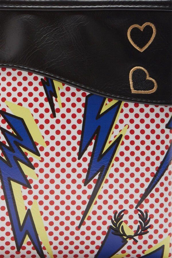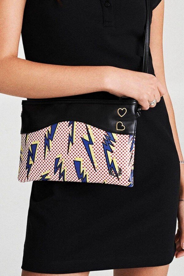Amy’nin bizim için yaptığı orijinal tasarımlardan ve sık sık taktığı bir çift şimşek küpesinden ilham alan baskılı yan çantamız, saf Amy’yi yansıtıyor. Koleksiyonun Defne Çelengi’nin üzerindeki alametifarikası olan işlenmiş aşk kalpleriyle tamamlanıyor.