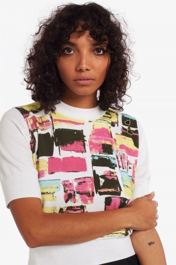 Amy’nin bizim için tasarladığı orijinal tasarımlara atıfta bulunan Baskılı Kısa Kollu Kazak, tamamı dijital baskı ve Amy’nin imza detaylarına sahiptir.