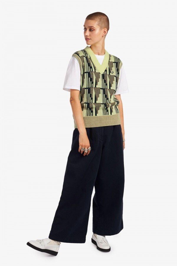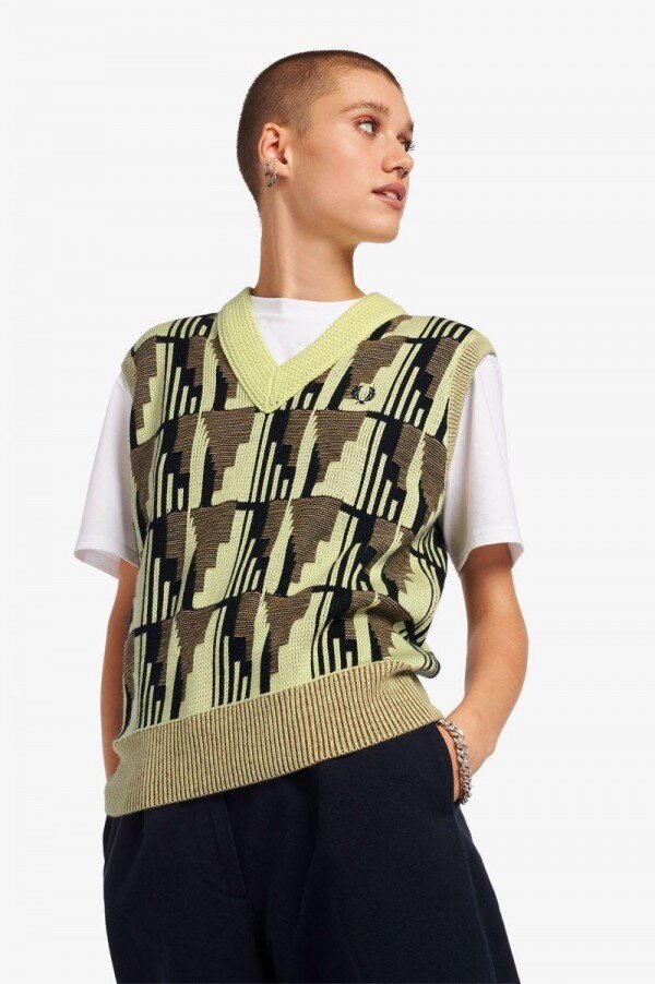 Giyinmenin ve bir şeyin parçası olmanın verdiği mutluluktan ilham alan Jakarlı Örme Atlet üstümüz, 70’ler ve 80’lerde Kent ve Essex’in soul kulüplerinin dans pistlerinde tanıdık gelecek olan eski terzilik ve stillerden tasarım ilhamı alıyor. Bir tişörtün üzerine veya tek başına giyilmek üzere tasarlanan bu üst, Jakarlı örme tekniği kullanılarak üretilmiş olup kalın V yakalı bir süslemeye ve imzamız olan Defne Çelengi işlemelerine sahip. Sizi farklı kılacak bir Fred Perry parçası Kalabalık.
