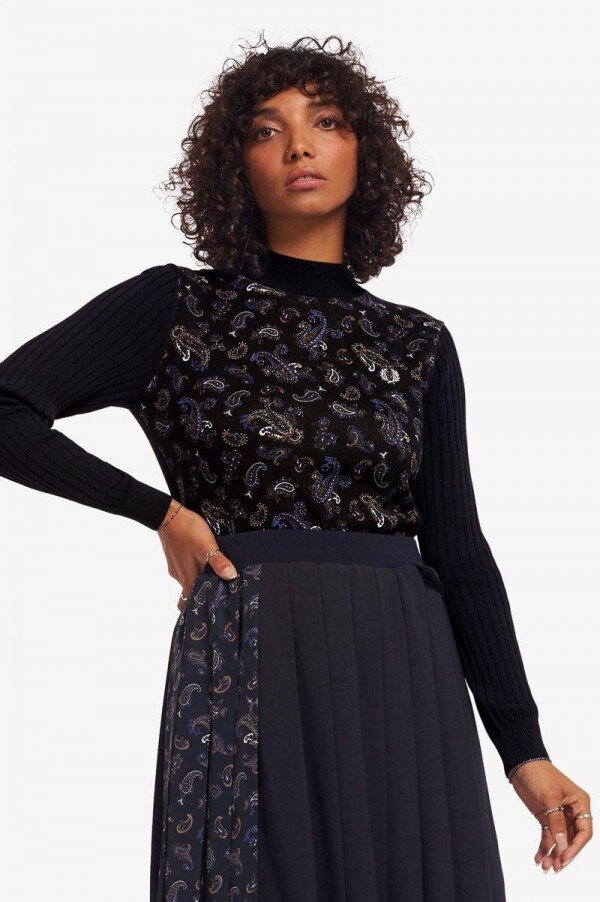 Viskon/naylon karışımı/Normal kesim/Yumuşak örme/Paisley desenli ön panel/Örme nervürlü kollar, yaka, etek ucu ve manşet