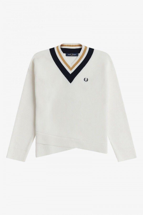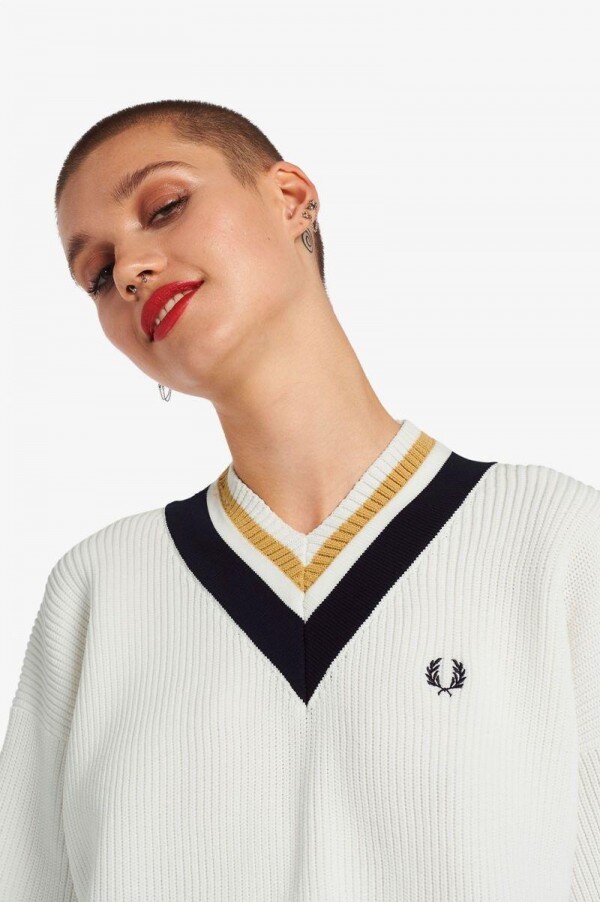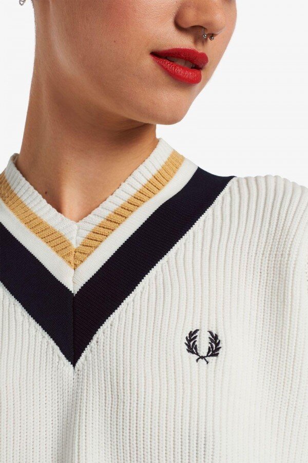 İngiliz alt kültür üniformasının şık bir parçası haline gelmeden önce, klasik V yakalı kazağımız başlangıçta tenis kortunda ısınmak için tasarlanmıştı. En son modelimiz dayanıklı polyester kumaştan üretildi ve yaka kısmında klasik uç motifine ve cesur asimetrik etek ucuna sahip. Baştan sona Fred Perry.