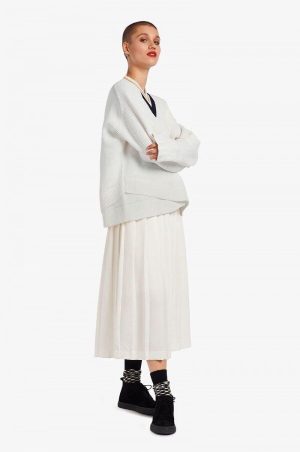 Dayanıklı polyester kumaştan yapılmış rahat V yakalı tenis kazağı. Boyun kısmında imzamız olan uçlar ve asimetrik etek ucu ile süslenmiştir.
