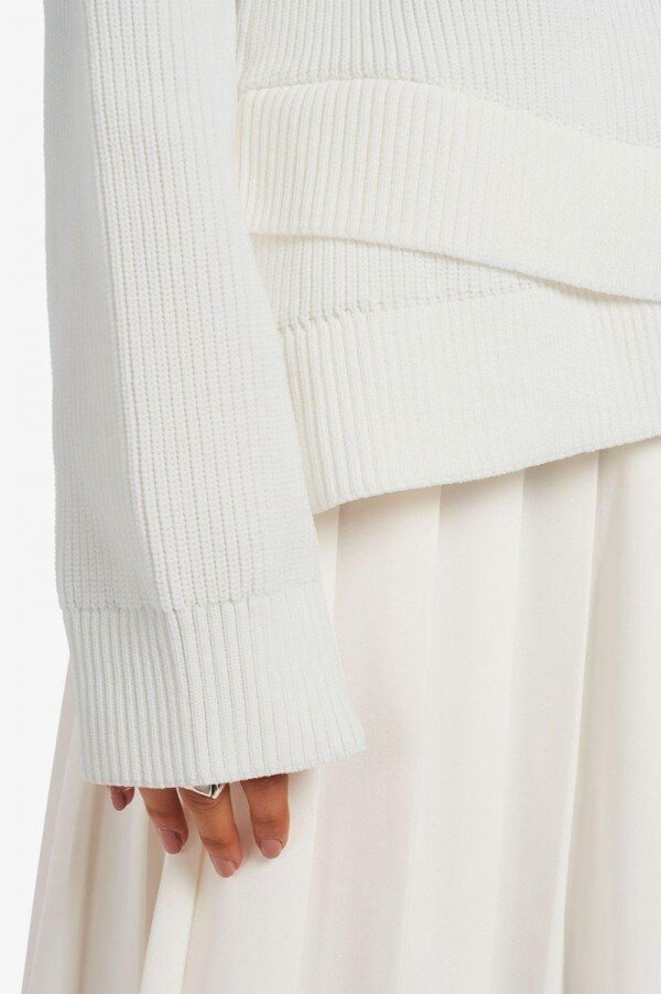 Polyester örme / Rahat kesim / Yarım hırka örme tekniği / Zıt renkli kalın yaka ve etek ucu / Etek ucu ve manşetlerde tek katmanlı ribana